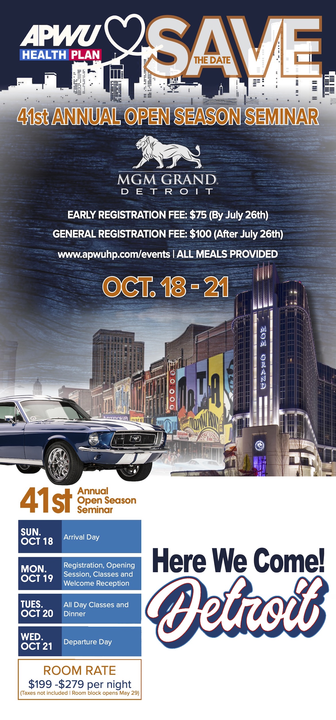 The APWU Health Plan 41st Annual Open Season Seminar will be held at the MGM Grand in Detroit, Michigan. Our room block will open for reservations on May 29.